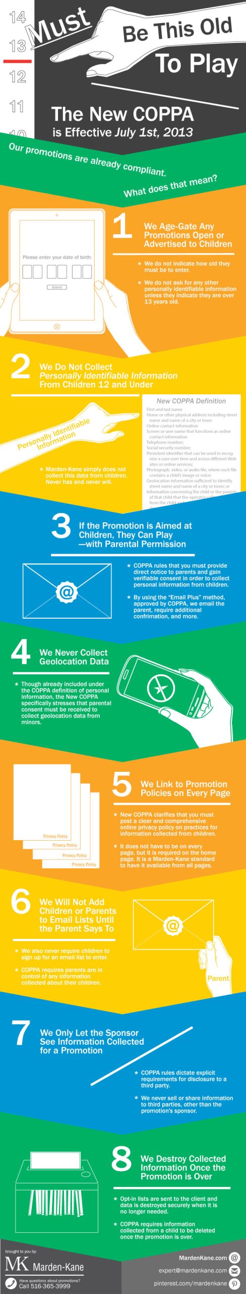 COPPA rules changes go into affect on July 1, 2013. Our infographic shows what these changes mean for promotions geared to children and how Marden-Kane is already compliant.