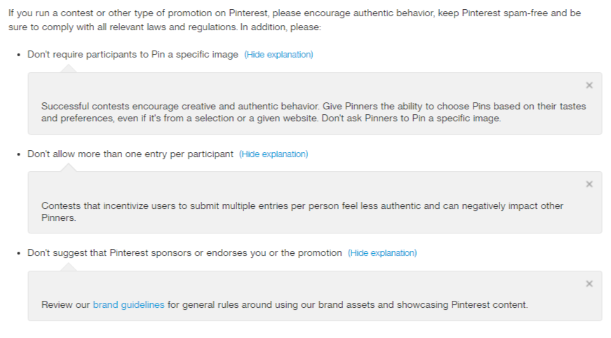 - Don’t suggest that Pinterest sponsors or endorses you or the promotion